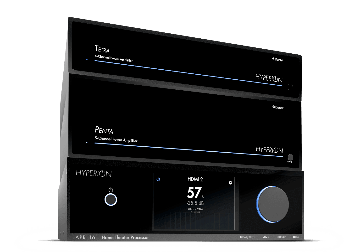 From the moment a system is powered on, Hyperion speaks to precision. The amplifiers harness Class H topology and advanced GaN output stages to achieve remarkable speed, power, and efficiency. The processors integrate deep DSP calibration for perfect room correction and timing. The receivers bring together reference-grade audio and video performance in one cohesive design. Every element works in unison to form a high-performance AV network capable of handling today’s most demanding formats while anticipating tomorrow’s.